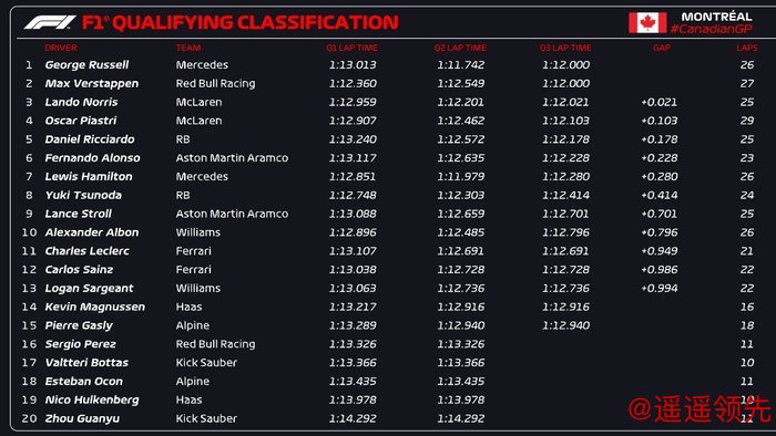 拉塞尔获得第3名,这是梅赛德斯车队今年首次在大奖赛中登上领奖台;汉密尔顿获得第4名,这是他本赛季首次在大奖赛中获得前五名;汉密尔顿在过去八届加拿大大奖赛中第二次未能登上领奖台;